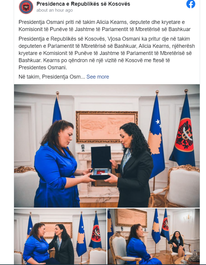 Presidentja e Republikës së Kosovës, Vjosa Osmani ka pritur në takim deputeten e Parlamentit të Mbretërisë së Bashkuar, Alicia Kearns, njëherësh kryetare e Komisionit të Punëve të Jashtme të Parlamentit të Mbretërisë së Bashkuar. Kearns po qëndron në një vizitë në Kosovë me ftesë të Presidentes Osmani.