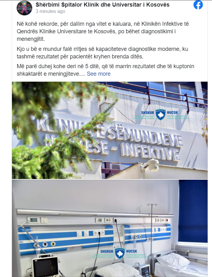Shërbimi Spitalor Klinik Universitar i Kosovës ka njoftuar se në kohë rekorde, për dallim nga vitet e kaluara, në Klinikën Infektive të Qendrës Klinike Universitare te Kosovës, po bëhet diagnostikimi i menengjitit.
