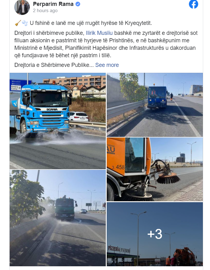 Rama në postimin e tij në Facebook ka thënë se drejtori i Shërbimeve Publike, Ilirik Musliu bashkë me zyrtarët e drejtorisë sot filluan aksionin e pastrimit të hyrjeve të Prishtinës, e në bashkëpunim me Ministrinë e Mjedisit, Planifikimit Hapësinor dhe Infrastrukturës u dakorduan që fundjavave të bëhet një pastrim i tillë.