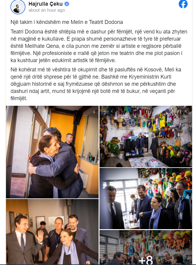 Çeku në postimin e tij në Facebook ka thënë se Teatri Dodona është shtëpia më e dashur për fëmijët, një vend ku ata zhyten në magjinë e kukullave. E prapa shumë personazheve të tyre të preferuar është Melihate Qena, e cila punon me zemër si artiste e regjisore përballë fëmijëve, një profesioniste e rrallë që jeton me teatrin dhe me plot pasion i ka kushtuar jetën edukimit artistik të fëmijëve.
