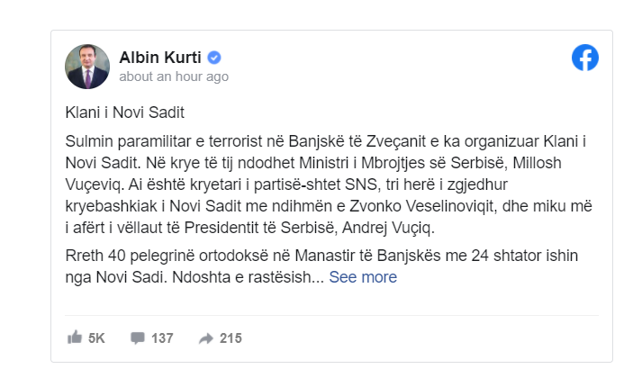 Kryeministri i Kosovës, Albin Kurti ka njoftuar se sulmin paramilitar e terrorist në Banjskë të Zveçanit e ka organizuar Klani i Novi Sadit, ku në krye të tij ndodhet ministri i Mbrojtjes së Serbisë, Millos Vucevic, kryetari i partisë-shtet SNS, tri herë i zgjedhur kryebashkiak i Novi Sadit me ndihmën e Zvonko Veselinovic-it dhe miku më i afërt i vëllaut të Presidentit të Serbisë, Andrej Vucic.
