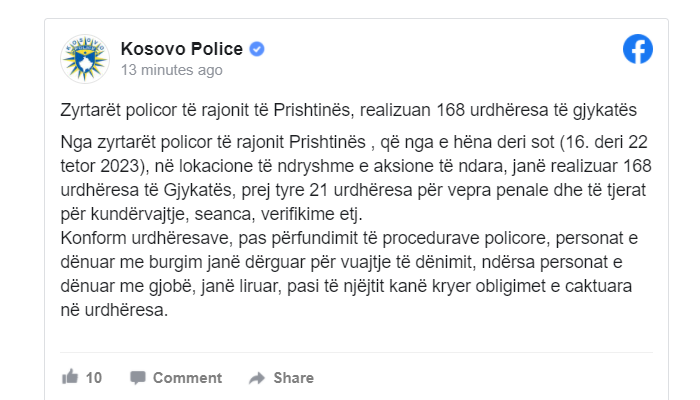 Nga zyrtarët policor të rajonit Prishtinës, në lokacione të ndryshme e aksione të ndara, janë realizuar 168 urdhëresa të Gjykatës, prej tyre 21 urdhëresa për vepra penale dhe të tjerat për kundërvajtje, seanca, verifikime etj.