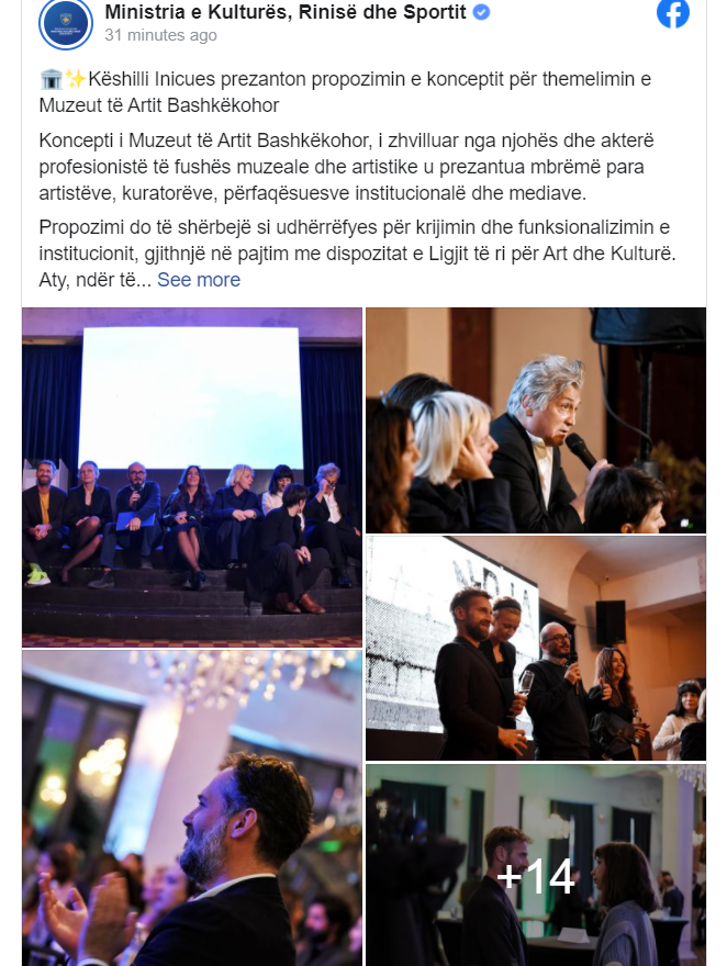 Ministria e Kulturës, Rinisë dhe Sportit ka njoftuar se koncepti i Muzeut të Artit Bashkëkohor, i zhvilluar nga njohës dhe akterë profesionistë të fushës muzeale dhe artistike u prezantua mbrëmë para artistëve, kuratorëve, përfaqësuesve institucionalë dhe mediave.