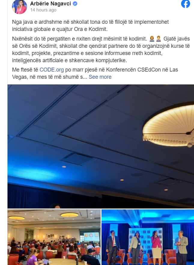 Nagavci në postimin e saj në Facebook ka thënë se nxënësit do të përgatiten e nxiten drejt mësimit të kodimit. Gjatë javës së Orës së Kodimit, shkollat dhe qendrat partnere do të organizojnë kurse të kodimit, projekte, prezantime e sesione informuese rreth kodimit, inteligjencës artificiale e shkencave kompjuterike.