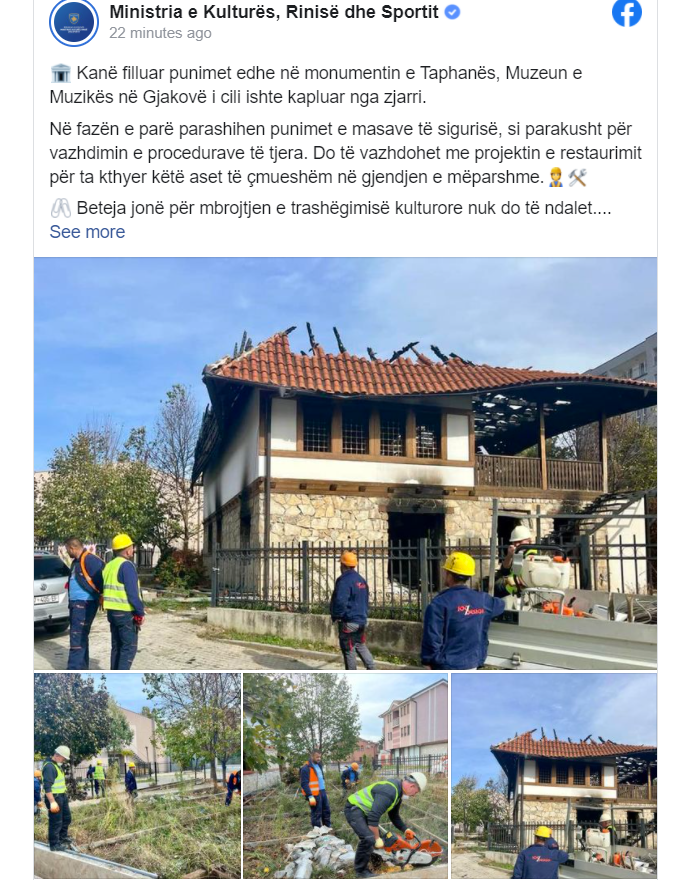 Ministria e Kulturës, Rinisë dhe Sportit ka njoftuar se kanë filluar punimet edhe në monumentin e Taphanës, Muzeun e Muzikës në Gjakovë i cili ishte kapluar nga zjarri.