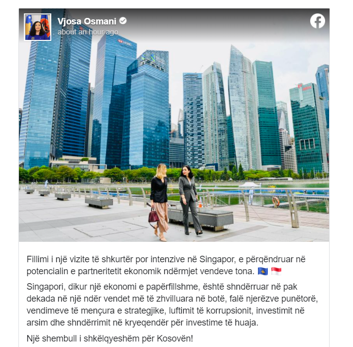 Presidentja Osmani në postimin e saj në Facebook ka thënë se Singapori, dikur një ekonomi e papërfillshme, është shndërruar në pak dekada në një ndër vendet më të zhvilluara në botë, falë njerëzve punëtorë, vendimeve të mençura e strategjike, luftimit të korrupsionit, investimit në arsim dhe shndërrimit në kryeqendër për investime të huaja. Një shembull i shkëlqyeshëm për Kosovën!