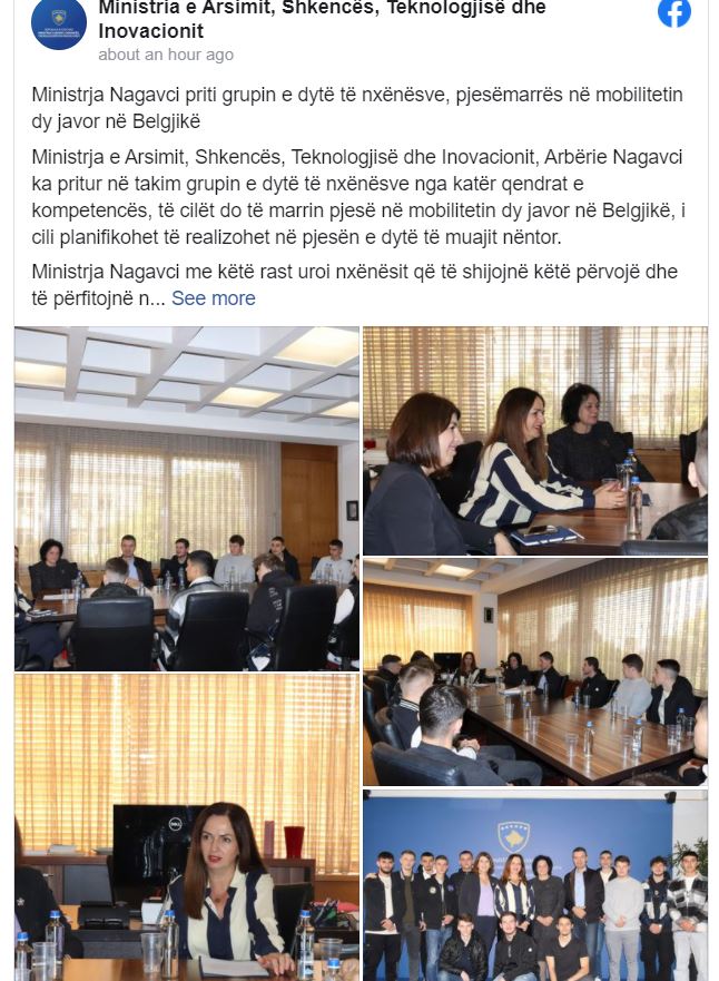 Ministrja e Arsimit, Shkencës, Teknologjisë dhe Inovacionit, Arbërie Nagavci ka pritur në takim grupin e dytë të nxënësve nga katër qendrat e kompetencës, të cilët do të marrin pjesë në mobilitetin dy javor në Belgjikë, i cili planifikohet të realizohet në pjesën e dytë të muajit nëntor.