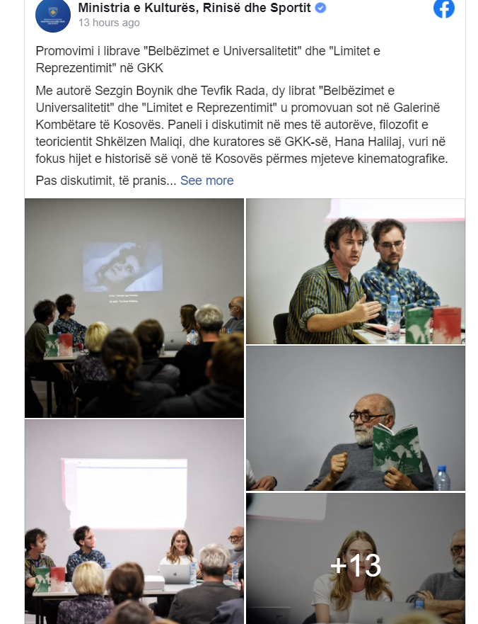 Ministria e Kulturës, Rinisë dhe Sportit ka njoftuar se në Galerinë Kombëtare të Kosovës u promovuan dy libra, “Belbëzimet e Universalitetit” dhe “Limitet e Reprezentimit” me autorë Sezgin Boynik dhe Tevfik Rada. Paneli i diskutimit në mes të autorëve, filozofit e teoricientit Shkëlzen Maliqi dhe kuratores së GKK-së, Hana Halilaj, vuri në fokus hijet e historisë së vonë të Kosovës përmes mjeteve kinematografike.
