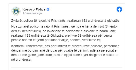 Nga zyrtarët policor të rajonit Prishtinës , që nga 6 nëntor deri 12 nëntor në lokacione të ndryshme e aksione të ndara, janë realizuar 183 urdhëresa të Gjykatës, prej tyre 39 urdhëresa për vepra penale ndërsa të tjerat për kundërvajtje, seanca, verifikime etj.