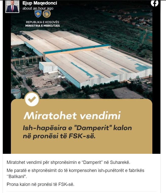 Ministria e Mbrojtjes ka bërë të ditur se është miratuar vendimi për shpronësimin e “Damperit” në Suharekë.