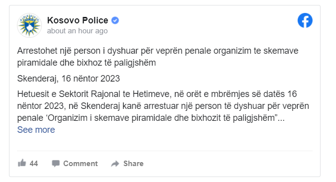Ndërsa pas intervistimit me urdhër të prokurorit të rastit, të dyshuarit i është caktuar masa e ndalimit për 48 orë. Ndaj tije është iniciuar rast për veprën penale ”Organizim i skemave piramidale dhe bixhozit të paligjshëm”, thuhet në postimin në Facebook të PK-së.
