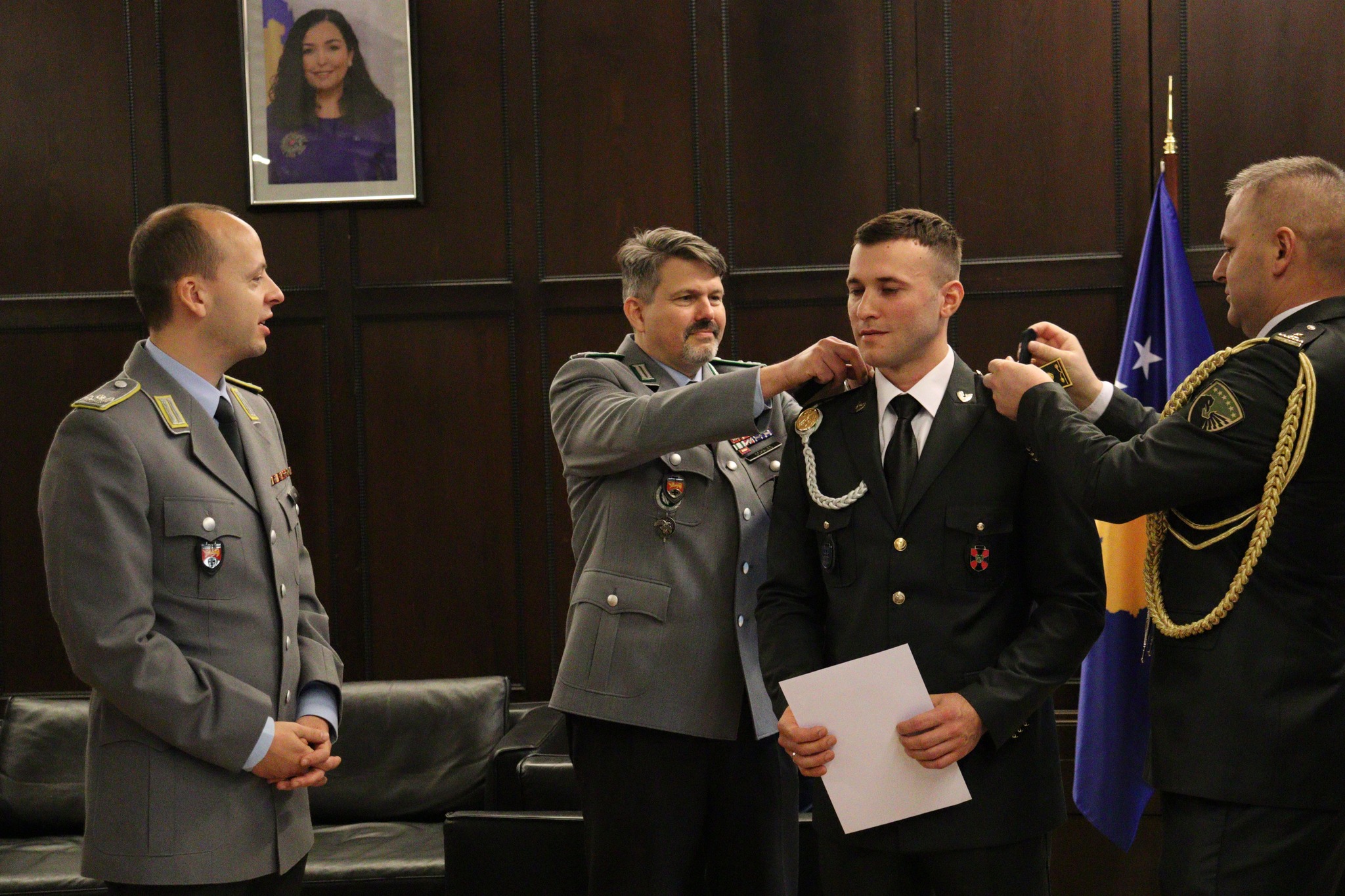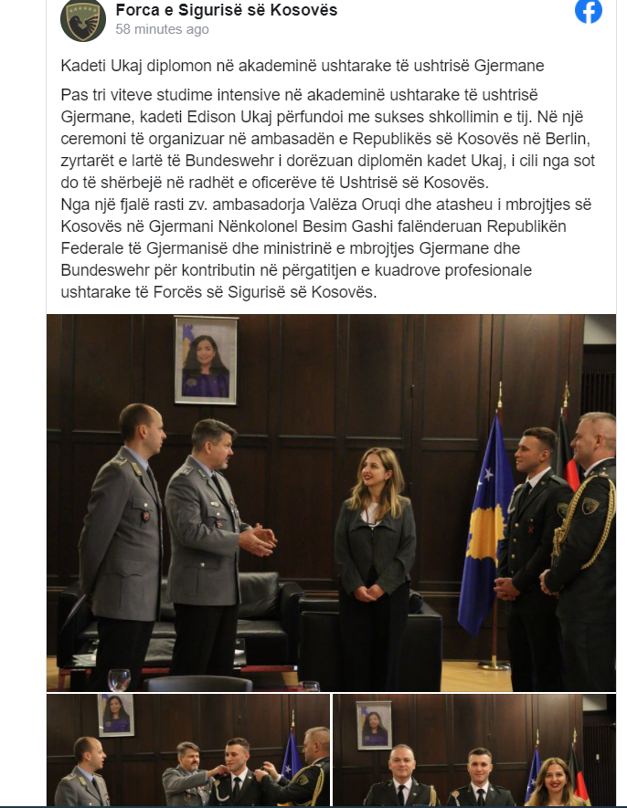 Forca e Sigurisë së Kosovës ka njoftuar se pas tri viteve studime intensive në akademinë ushtarake të ushtrisë Gjermane, kadeti Edison Ukaj përfundoi me sukses shkollimin e tij. Në një ceremoni të organizuar në ambasadën e Republikës së Kosovës në Berlin, zyrtarët e lartë të Bundeswehr i dorëzuan diplomën kadet Ukaj, i cili nga sot do të shërbejë në radhët e oficerëve të Ushtrisë së Kosovës.