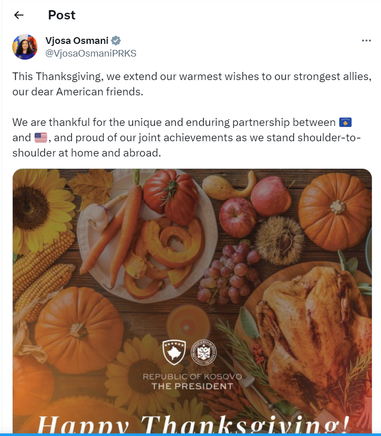 Presidentja Osmani në postimin e saj në Twitter ka thënë se në këtë Ditë Falënderimi, ne i shprehim urimet tona më të ngrohta aleatëve tanë më të fortë, miqve tanë të dashur amerikanë.