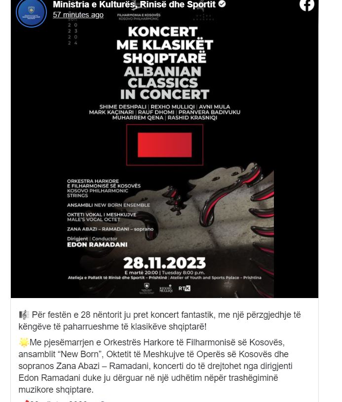Ministria e Kulturës, Rinisë dhe Sportit ka njoftuar se për festën e 28 Nëntorit në Atelen e Pallatit të Rinisë dhe Sportit në Prishtinë do të mbahet koncert me një përzgjedhje të këngëve të paharrueshme të klasikëve shqiptarë!