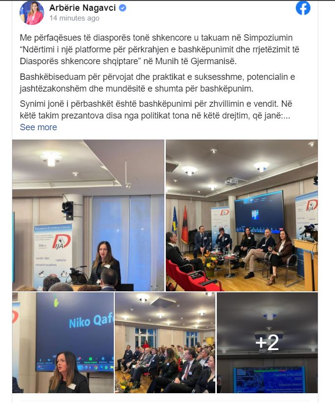 Ministrja e Arsimit, Shkencës, Teknologjisë dhe Inovacionit, Arbërie Nagavci ka njoftuar se në Munih të Gjermanisë është takuar me përfaqësues të diasporës tonë shkencore në Simpoziumin “Ndërtimi i një platforme për përkrahjen e bashkëpunimit dhe rrjetëzimit të Diasporës shkencore shqiptare”.
