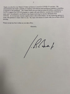Presidenti Biden i është përgjigjur edhe kërkesës së presidentes Osmani që SHBA-të të ndihmojnë me vaksina, bazuar në letrën e saj të 19 marsit.
