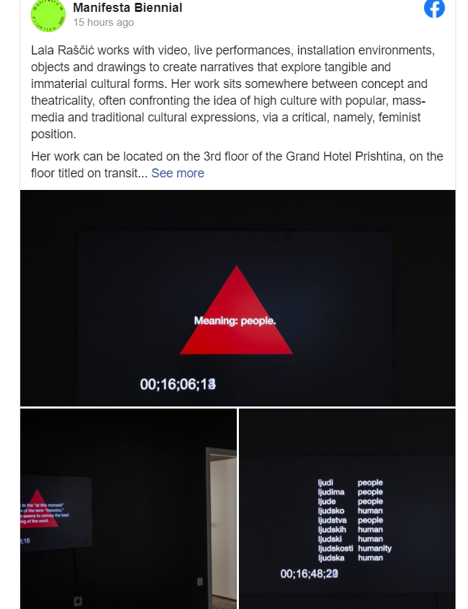 Manifesta 14 njofton se Lala Raščić punon me video, perfomanca të drejtpërdrejta, instalacione në mjedis, objekte dhe vizatime për të krijuar një narrativë që eksploron format e prekshme dhe jomateriale kulturore.