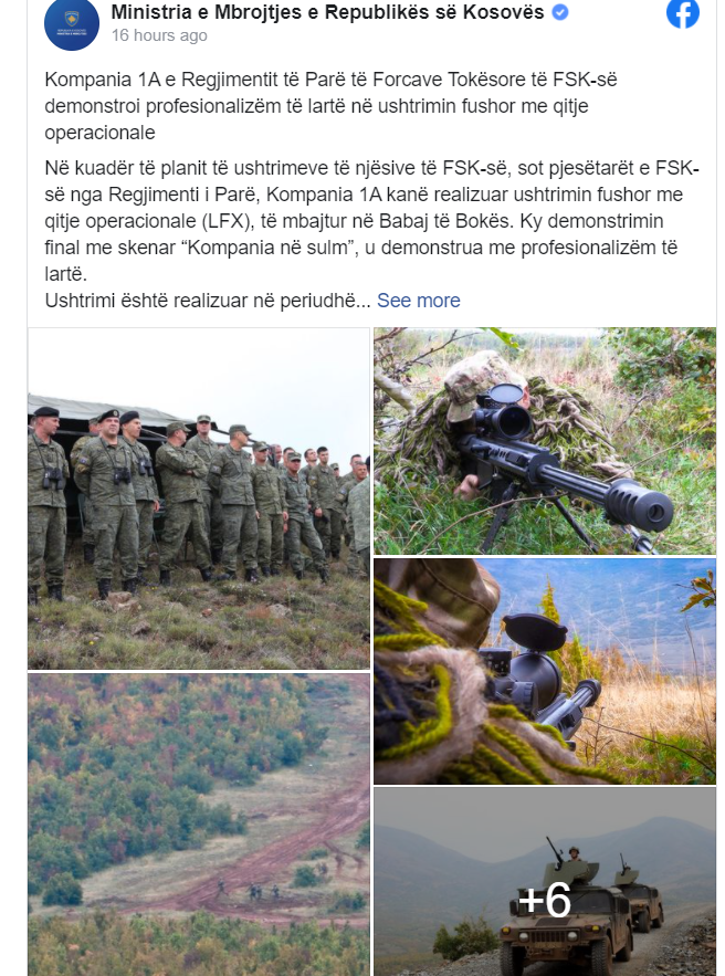 Në kuadër të planit të ushtrimeve të njësive të FSK-së, sot pjesëtarët e FSK-së nga Regjimenti i Parë, Kompania 1A kanë realizuar ushtrimin fushor me qitje operacionale (LFX), të mbajtur në Babaj të Bokës. Ky demonstrimin final me skenar “Kompania në sulm”, u demonstrua me profesionalizëm të lartë.
