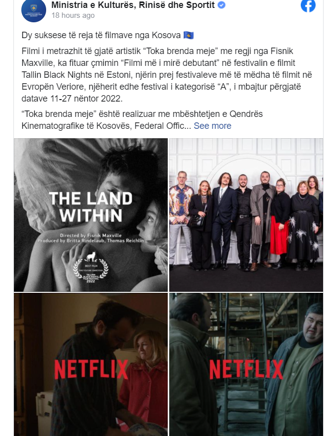 Ministria e Kulturës njofton se filmi i metrazhit të gjatë artistik “Toka brenda meje” me regji nga Fisnik Maxville, ka fituar çmimin “Filmi më i mirë debutant” në festivalin e filmit Tallin Black Nights në Estoni, njërin prej festivaleve më të mëdha të filmit në Evropën Veriore, njëherit edhe festival i kategorisë “A”, i mbajtur përgjatë datave 11-27 nëntor 2022.