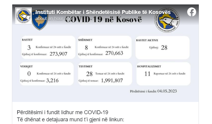 Instituti Kombëtar i Shëndetësisë së Kosovës përmes postimit në rrjetin social Facebook, ka publikuar rastet e të infektuarve me COVID-19, më 05.05.2023.