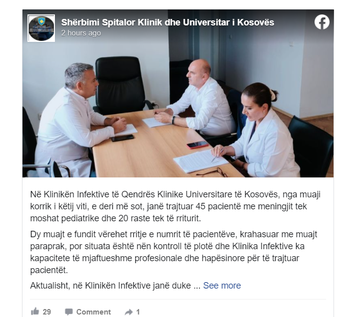 Meningjiti trajtohet vetëm në spital, thuhet në postimin në Facebook të ShSKUK-së.