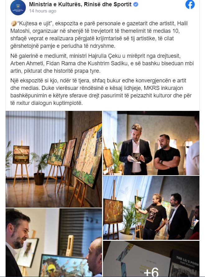 Në galerinë e mediumit, ministri Hajrulla Çeku u mirëprit nga drejtuesit, Arben Ahmeti, Fidan Rama dhe Kushtrim Sadiku, e së bashku biseduan mbi artin, pikturat dhe historitë prapa tyre.