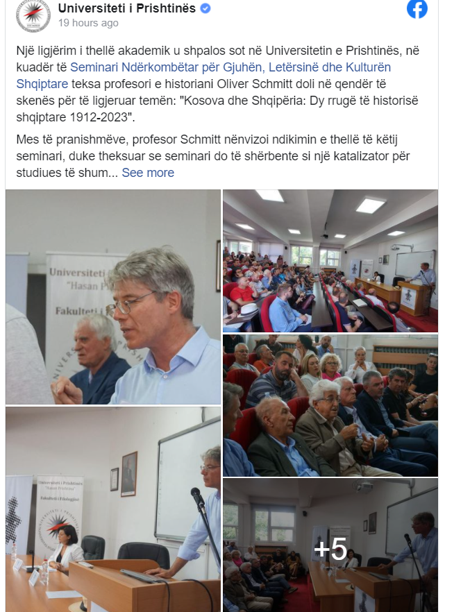 Universiteti i Prishtinës ka njoftuar se një ligjërim i thellë akademik u shpalos sot në Universitetin e Prishtinës, në kuadër të Seminari Ndërkombëtar për Gjuhën, Letërsinë dhe Kulturën Shqiptare teksa profesori e historiani Oliver Schmitt doli në qendër të skenës për të ligjeruar temën: “Kosova dhe Shqipëria: Dy rrugë të historisë shqiptare 1912-2023”.
