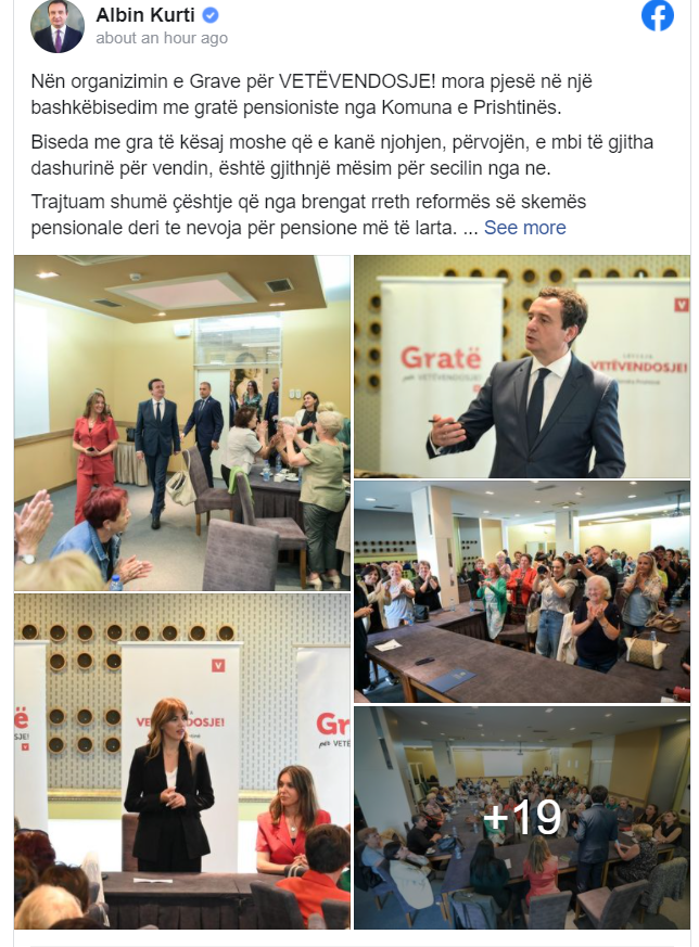 Nën organizimin e Grave për Vetëvendosje! kryeministri Albin Kurti ka marrë pjesë në një bashkëbisedim me gratë pensioniste nga Komuna e Prishtinës ku kanë trajtuar shumë çështje që nga brengat rreth reformës së skemës pensionale deri te nevoja për pensione më të larta.
