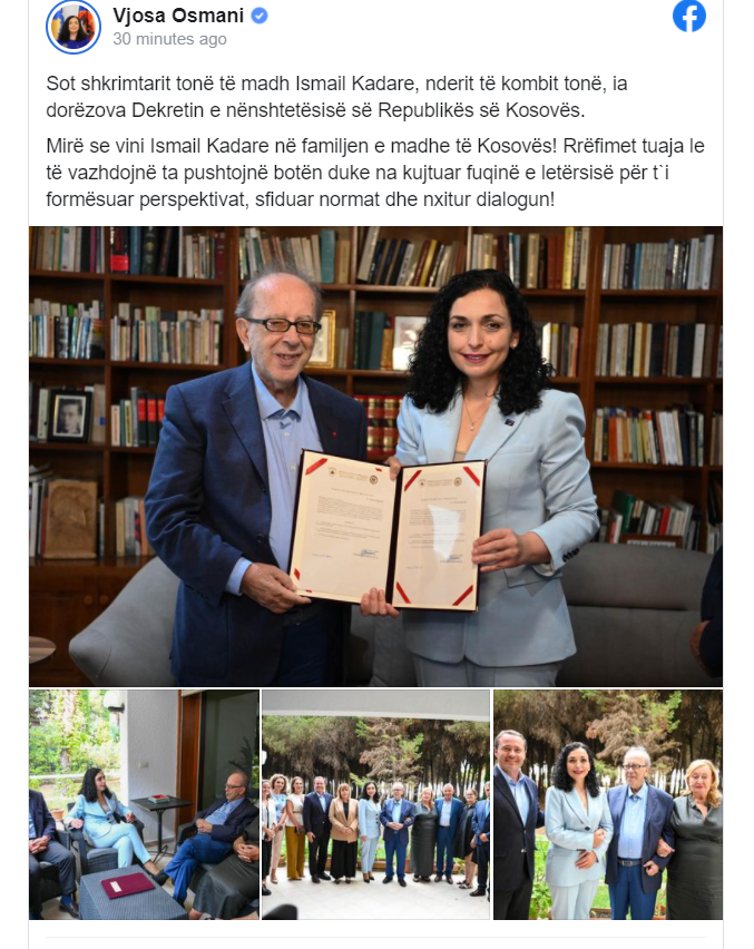 Presidentja e Kosovës, Vjosa Osmani ka njoftuar se shkrimtarit Ismail Kadare, nderit të kombit tonë, ia ka dorëzuar Dekretin e nënshtetësisë së Republikës së Kosovës.