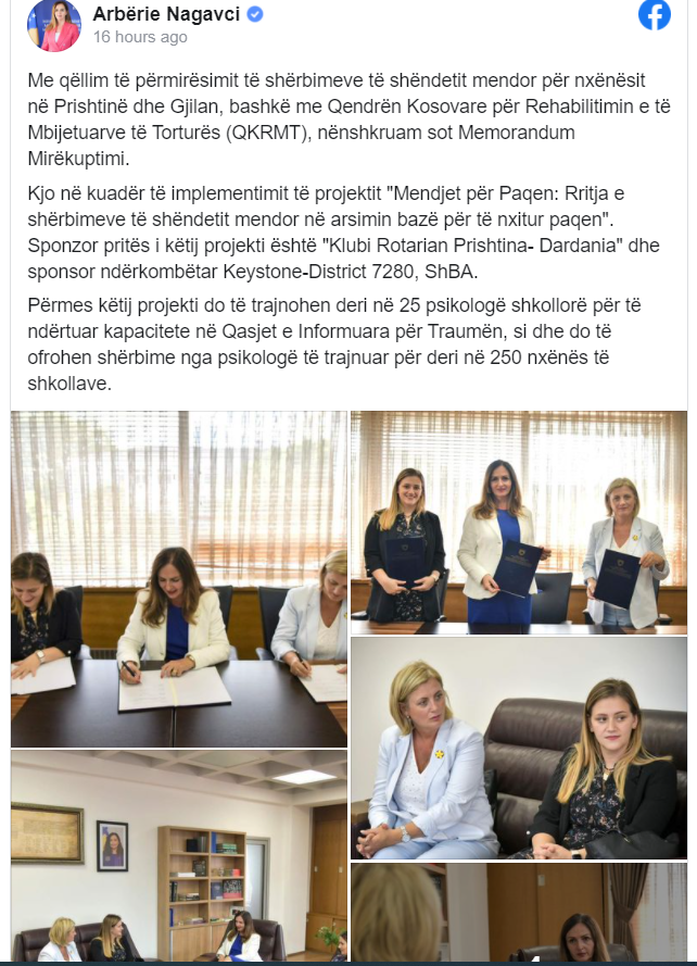 Ministrja e Arsimit, Shkencës dhe Teknologjisë, Arbërie Nagavci ka njoftuar se me qëllim të përmirësimit të shërbimeve të shëndetit mendor për nxënësit në Prishtinë dhe Gjilan, bashkë me Qendrën Kosovare për Rehabilitimin e të Mbijetuarve të Torturës (QKRMT), kanë nënshkruar Memorandum Mirëkuptimi.
