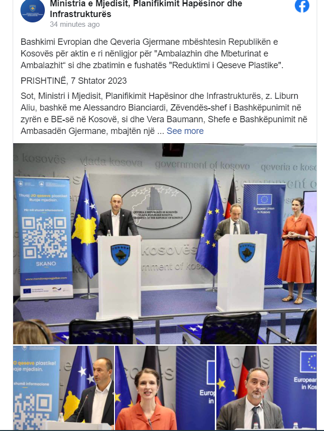 Ministri i Mjedisit, Planifikimit Hapësinor dhe Infrastrukturës, Liburn Aliu, bashkë me Alessandro Bianciardi, zëvendës-shef i Bashkëpunimit në zyrën e BE-së në Kosovë, si dhe Vera Baumann, shefe e Bashkëpunimit në Ambasadën Gjermane, mbajtën një konferencë të përbashkët për media, ndërlidhur me aktin e sapomiratuar nënligjor mbi “Ambalazhin dhe Mbeturinat e Ambalazhit“ si dhe për lansimin e fushatës “Reduktimi i Qeseve Plastike”.