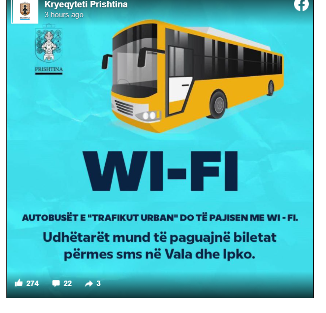 Komuna e Prishtinës ka bërë të ditur se shumë shpejt autobusët e Trafikut Urban Prishtinë do të pajisen me Wi-Fi.