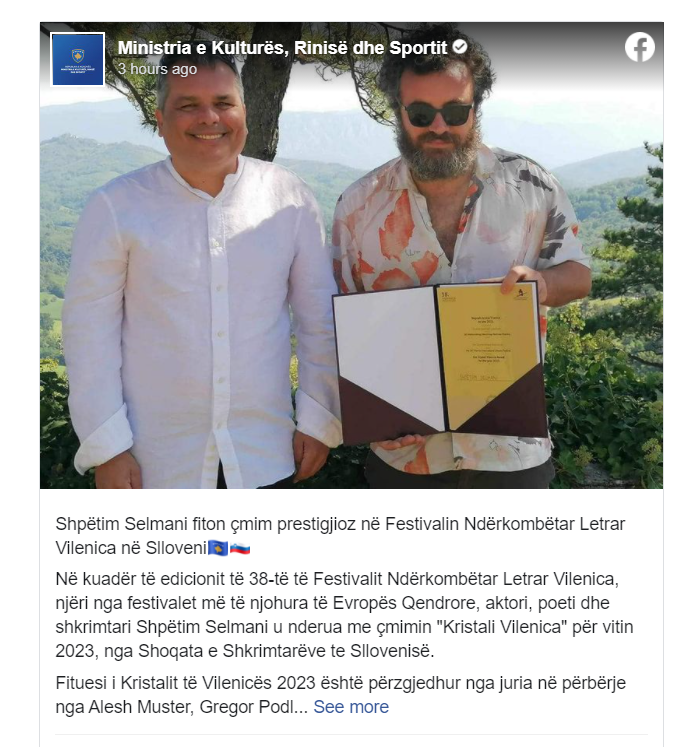 Ministria e Kulturës e përgëzon artistin Selmani për këtë çmim të merituar si dhe e falënderon për kontributin e tij në promovimin e kulturës dhe letërsisë së Kosovës në skenën ndërkombëtare, thuhet në postimin në Facebook të MKRS-së.