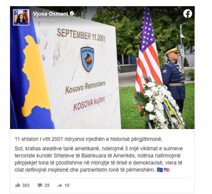 Presidentja Osmani në postimin e saj në Facebook ka thënë se sot, krahas aleatëve tanë amerikanë, nderojmë 3 mijë viktimat e sulmeve terroriste kundër Shteteve të Bashkuara të Amerikës, ndërsa riafirmojmë përpjekjet tona të çdoditshme në mbrojtje të lirisë e demokracisë, vlera të cilat definojnë miqësinë dhe partneritetin tonë të përhershëm.