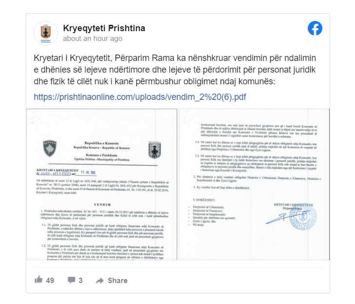 Komuna e Prishtinës ka bërë të ditur se kryetari, Përparim Rama ka nënshkruar vendimin për ndalimin e dhënies së lejeve ndërtimore dhe lejeve të përdorimit për personat juridik dhe fizik të cilët nuk i kanë përmbushur obligimet ndaj komunës, thuhet në postimin në Facebook të Komunës së Prishtinës.