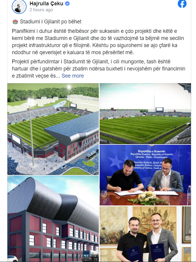 Çeku në postimin e tij në Facebook ka thënë se në marrëveshjen me kryetarin Alban Hyseni, zotuam 15 milionë euro për ndërtimin e stadiumit dhe se procedurat e nevojshme për zbatimin e projektit do të fillojnë menjëherë dhe punimet në tërësi do të nisin sa më parë.